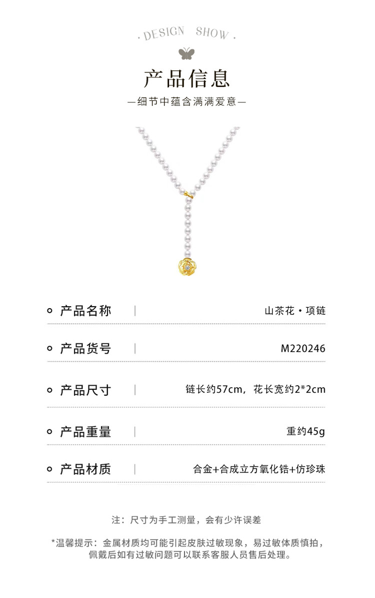 项链材质: 铜合金+合成立方氧化锆+仿珍珠 链扣材质: 铜合金 吊坠材质: 铜合金 镶嵌: 无镶嵌 主风格: 日韩风 长度: 51cm-80cm 是否含证书: 否 图案: 花朵 风格: 日韩 执行标准: GB 28480-2012 工艺: 电镀 包装形式: 品牌包装盒 规格: 可调节 链条长度(链长cm+延长链cm): 57cm 适用人群: 女士,情侣,儿童,青年,中老年 是否含防伪标识: 否 送礼节日: 情人节,520,七夕节,圣诞节 送礼对象: 送爱人,送女士 适用性别: 女士 生产/经销/进口厂家: 蔻斯琦(上海)贸易有限公司 厂家地址: 上海市徐汇中路20号西岸创意园二号楼2205室 佩戴&保养建议: 1、请在洗澡时候取下,以免沐浴露洗发水等腐蚀金属。2、不佩戴本产品请将产品存放在我司提供的首饰盒内密封保存,以免接触空气氧化。 产地: 中国 商品配件: 暂无 商品编码: M220246
