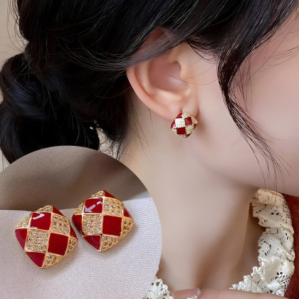 红色棋盘格小众耳钉女轻奢高级感气质耳环新款2024爆款耳饰品
