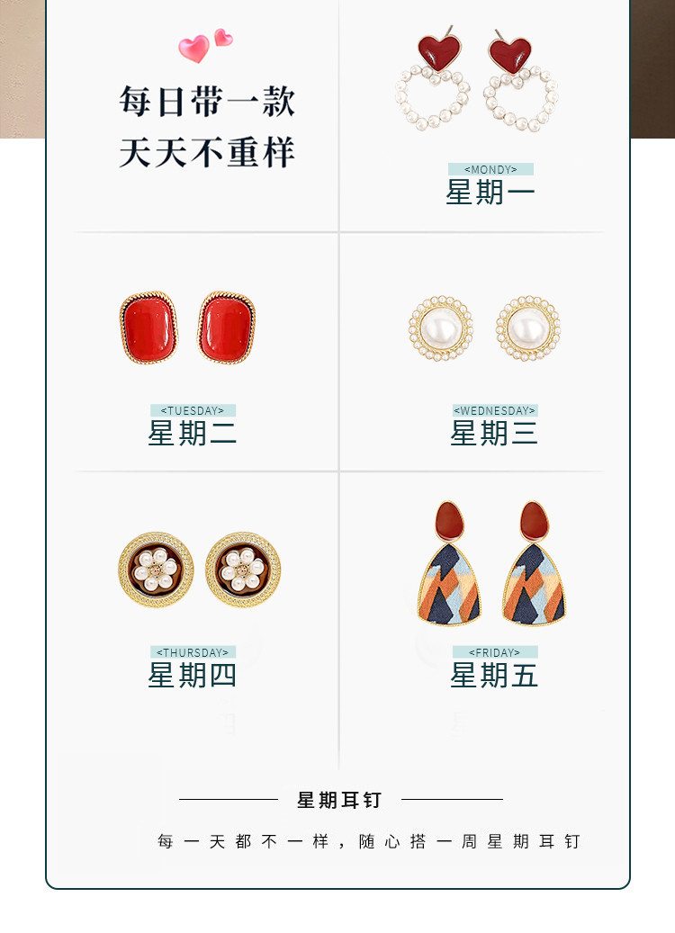 主款式: 耳环 是否含耳堵: 是 耳堵材质: 塑料 风格: 日韩 适用性别: 女士 镶嵌: 无镶嵌 规格数量: 五对 耳环/耳钉材质: 合金+S925银针+仿珍珠+塑料 耳针材质: 925银 类型: 耳环 规格: 均码 工艺: 电镀 适用人群: 女士,青年,中老年 包装形式: 品牌包装盒 佩戴&保养建议: 1、请在洗澡时候取下,以免沐浴露洗发水等腐蚀金属。2、不佩戴本产品请将产品存放在我司提供的首饰盒内密封保存,以免接触空气氧化。 主风格: 通勤风 图案: 爱心 生产/经销/进口厂家: 蔻斯琦(上海)贸易有限公司 厂家地址: 上海市徐汇中路20号西岸创意园二号楼2205室 执行标准: GB 28480-2012 是否含防伪标识: 否 产地: 中国 商品卖点: 爆款直降 商品配件: 暂无 商品编码: M230007